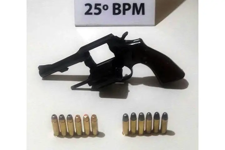 De acordo com a Polícia Militar, uma equipe realizava o patrulhamento pelo centro quando avistou dois homens em atitude suspeita e resolveram realizar a abordagem. No momento da abordagem, os suspeitos correram e entrara no quintal de uma residência. Ao realizar busca, foi localizado um homem homiziado no jardim da casa de posse de um revólver municiado com seis cartuchos intactos e mais 06 munições fixadas em um coldre. Ao ser indagado sobre seu nome o mesmo passou um nome falso, mas logo foi descoberto o seu nome verdadeiro. Ao checar o seu nome foi constatado um mandado de prisão em seu desfavor pelos crimes de roubo e furto.