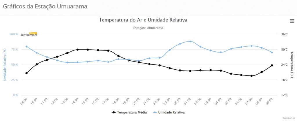 Em Umuarama, na terça-feira (29), população pode esperar outro dia ensolarado e sem previsão de ocorrência de chuva, e temperaturas variando entre 32°C e 21°C. Na quarta (30) a temperatura se mantém semelhante, ficando entre 32°C e 19°C, porém este segue com previsão de chuva.