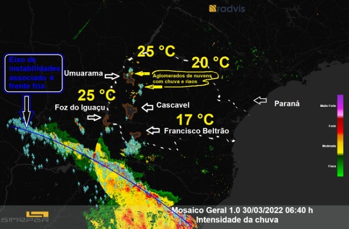Destaca-se na imagem de radar do Simepar, o panorama de chuva com raios e o posicionamento das instabilidades que estão progredindo até até região, é o que informa meteorologista Fernando Mendonça Mendes.