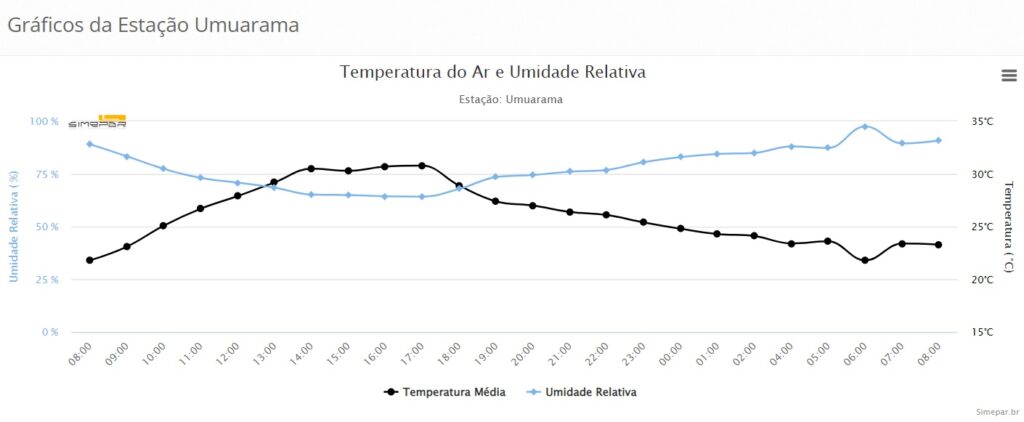 Em Umuarama, população pode contar com uma queda na temperatura, que deverá se manter entre 24°C e 17°C na quinta-feira (31), e 21°C e 17°C na sexta-feira (Abril, 1). Para ambos os dias a previsão é de tempo nublado e ocorrência de chuva.