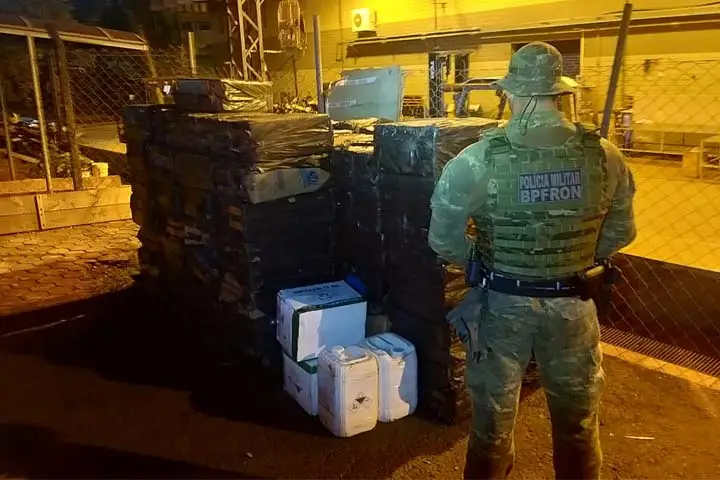 Após denúncia anônima via Copom, policiais da equipe do BPFRON apreenderam 140 caixas de cigarros e uma pequena quantidade de agrotóxicos e herbicidas em Itaipulândia. O material apreendido foi levado para a Receita Federal de Foz do Iguaçu.