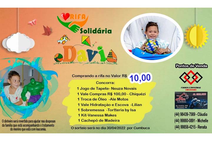 A família do pequeno Davi, de 4 anos, lançou uma Rifa Solidária para ajudar a criança que sofre com uma leucemia e encontra-se internado em tratamento no Uopeccan de Umuarama. O valor por unidade é de R$ 10.
