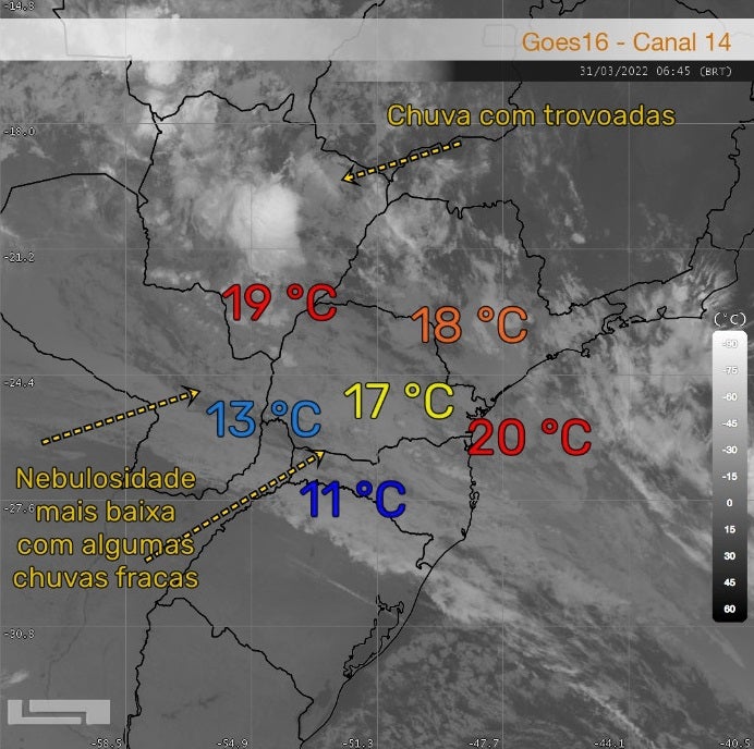 Na região do Paraná predomina no céu muitas nuvens de característica baixa. Algumas chuvas de intensidade fraca também ocorrem associadas a estas nuvens, entre as regiões do estado. As temperaturas em média estão agradáveis, embora ligeiramente frio entre os setores oeste e sul do estado, com valores entre 10 e 13 °C, de acordo com Fernando Mendonça Mendes, meteorologista.