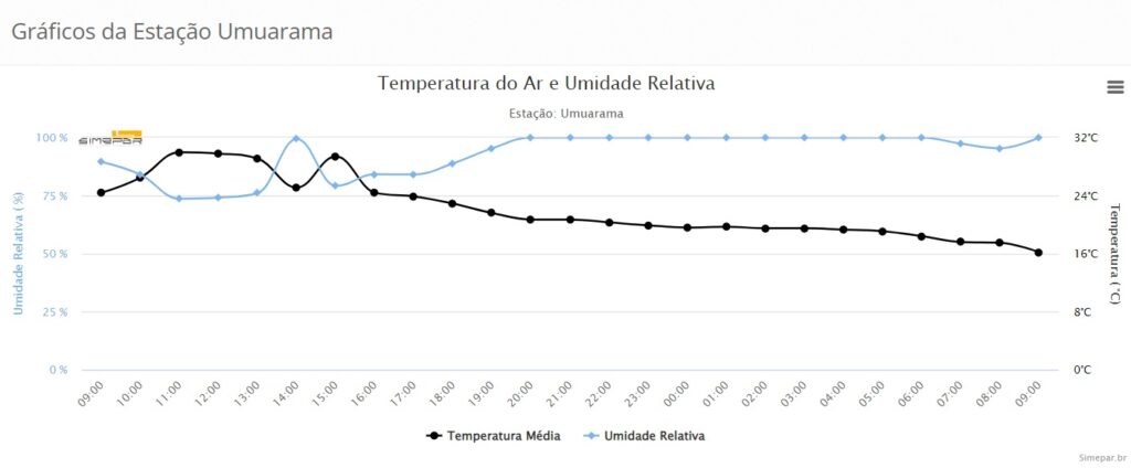 Em Umuarama na sexta-feira (1), população pode esperar temperaturas oscilando entre 19°C e 16°C, com ocorrência de muita chuva ao longo do dia. No sábado (2), a chuva cessa e a temperatura sobe, se mantendo entre 27°C e 22°C.
