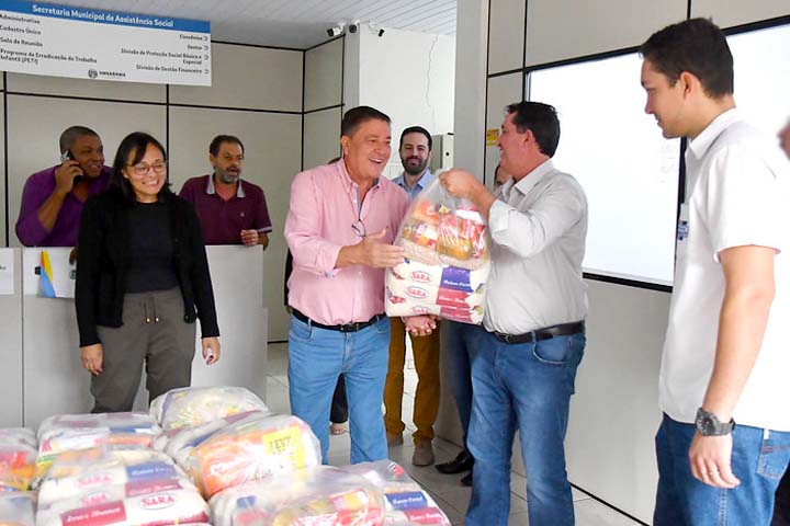 A Sociedade Rural de Umuarama (SRU) entregou 150 cestas básicas para a Secretaria Municipal de Assistência Social, que serão encaminhadas para os três centros de referência (Cras) que atendem famílias em situação de vulnerabilidade. O prefeito Hermes Pimentel, o presidente da Rural, Milton Gaiari, vereadores e secretários municipais acompanharam a entrega na tarde desta sexta-feira (1º).