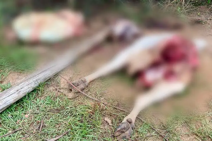 Os policiais encontraram os restos do animal no fundo da propriedade. Apesar de ter sido abatido e esquartejado, os autores do crime não levaram a carne que foi separada em grandes partes.