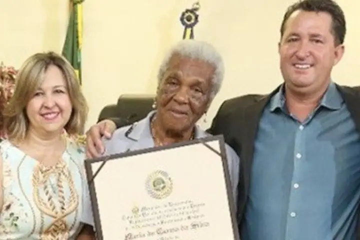 Na foto acima, dona Maria está com a primeira-dama do município, Rozileni Moreira Alves Pimentel, e o prefeito Hermes Pimentel, que rendem a homenagem.