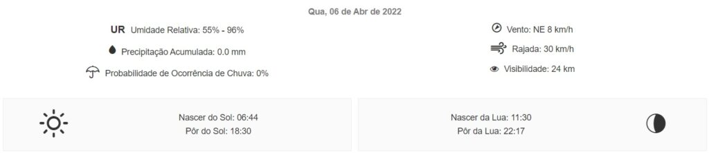 Na quinta-feira (7) a previsão é de ocorrência de chuva principalmente no fim da tarde e início da noite, além de temperaturas que deverão oscilar entre 31°C e 22°C; na sexta (8) a máxima será de 32°C e mínima 22°C, além de tempo nublado e sem previsão de chuva.