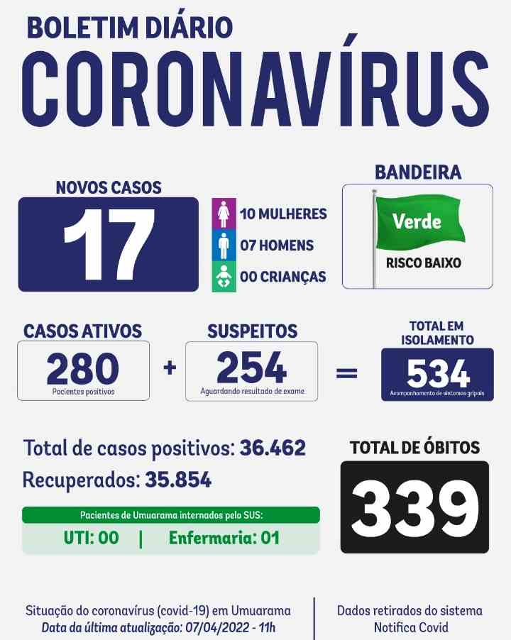 Nesta quinta-feira (7) o Boletim Covid, emitido diariamente pela Secretaria Municipal de Saúde de Umuarama, informa que 17 novos casos foram confirmados, sendo dez mulheres, sete homens e nenhuma criança – coincidentemente ontem (6) também foram informados 17 casos (sete mulheres e 10 homens). A média do mês é de 22 casos/dia.