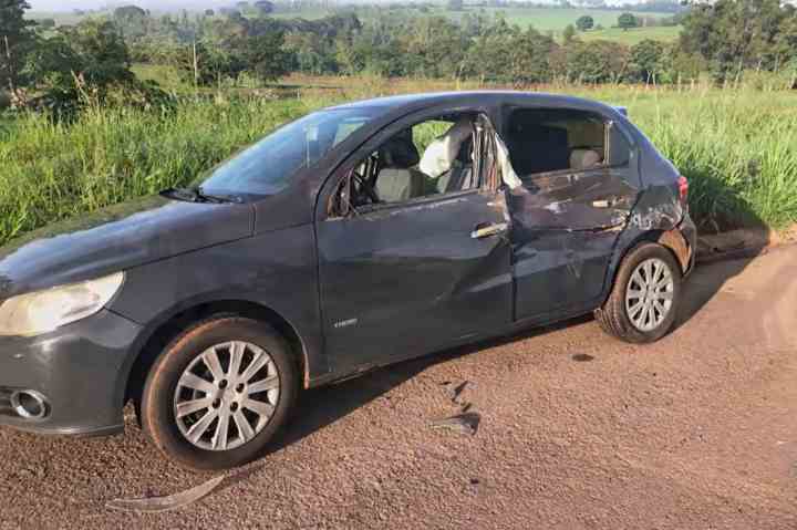 Ao tentar volta para sua pista, o condutor da caminhonete acabou capotando. Mesmo assim ele atingiu o Gol, que tem placas de Mundo Novo/MS.
