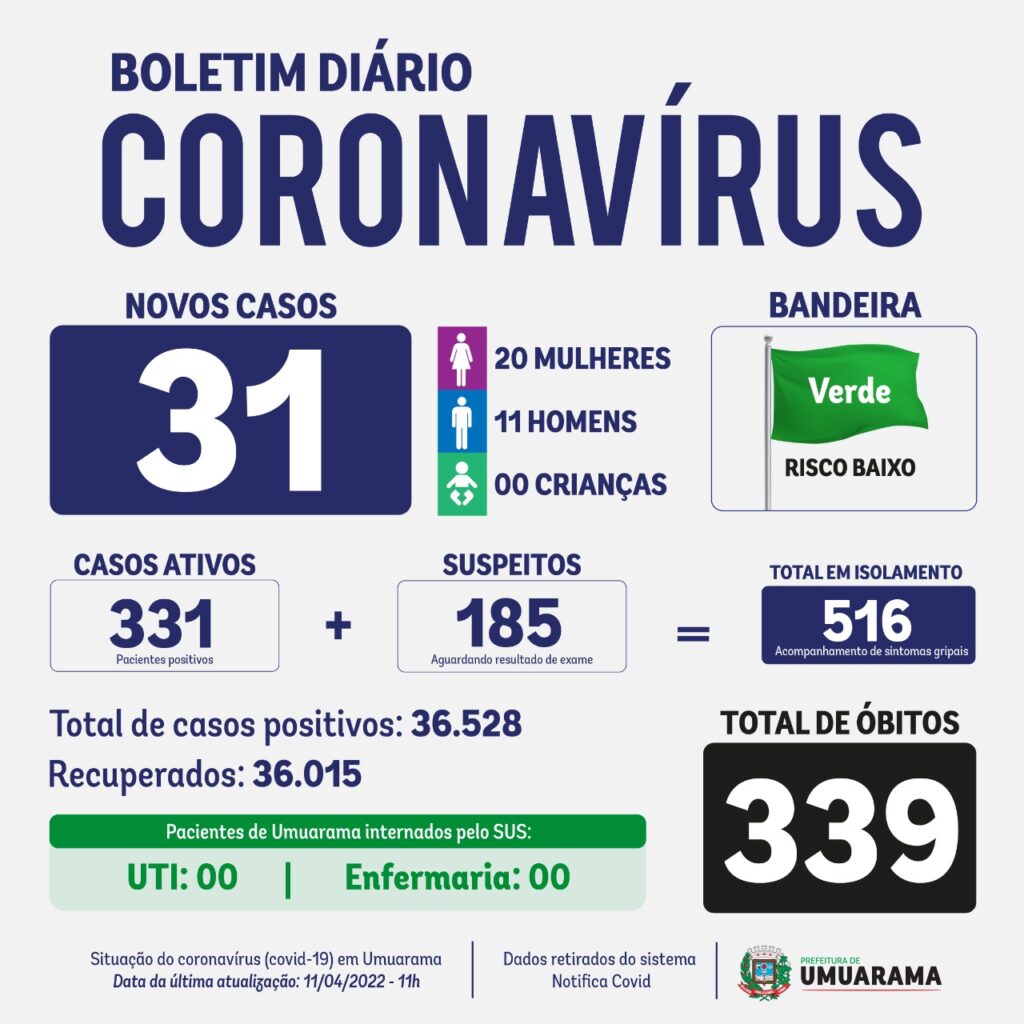 Trazendo dados do final de semana, o Boletim Covid desta segunda-feira (11) informa 31 novos casos confirmados, sendo 20 mulheres e 11 homens – e nenhuma criança.