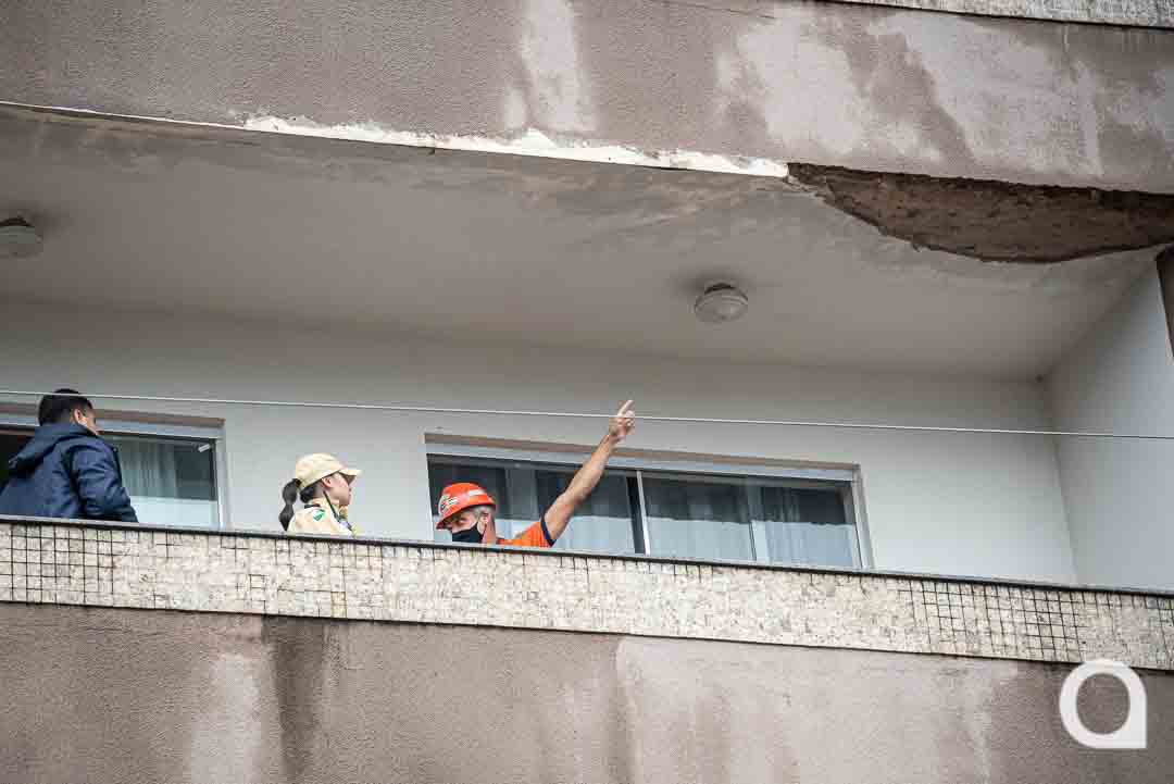 Equipes do Corpo de Bombeiros e da Defesa Civil foram acionadas para verificar o local e analisar sobre a possibilidade de uma interdição. Quem percebeu o fato foram os vizinhos. Renato Lopes mora no apartamento de baixo e comentou que parte do reboco desprendido caiu na sua sacada. No momento apenas a esposa e o filho estavam em casa e a mulher teve um grande susto.