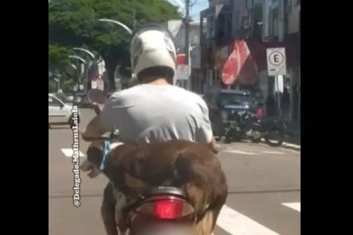 O condutor de uma moto foi flagrado cometendo uma irregularidade de trânsito ao transportar um cachorro na garupa. A cena foi postada nesta quarta-feira (13) pelo delegado Matheus Laiola em seu Instagram, que recebeu as imagens. O flagrante aconteceu na avenida Paraná, centro da cidade.