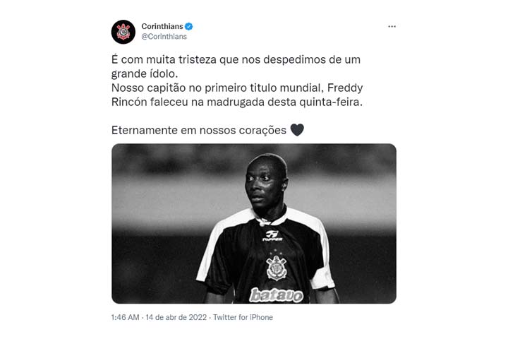 A morte do craque foi lembrada nas redes sociais por alguns dos times em que jogou. “É com muita tristeza que nos despedimos de um grande ídolo. Nosso capitão no primeiro título mundial, Freddy Rincón faleceu na madrugada desta quinta-feira. Eternamente em nossos corações”, tuitou o Corinthians. “Obrigado por tudo, Rincón!”, postou o Palmeiras, que também teve o jogador em seu elenco.