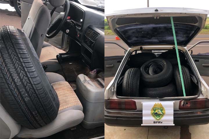 A Polícia Rodoviária Estadual (PRE) apreendeu um veículo Ford/Escort, com placas de Assis Chateaubriand carregado com 60 pneus contrabandeados do Paraguaia. Os pneus da marca NEUPAR, de medidas variadas estavam no porta-malas, banco traseiro e no banco do passageiro e não possuía nenhuma documentação legal.