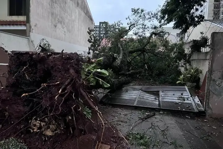Uma moradora levou um susto quando escutou o barulho da queda de uma árvore sobre o terreno onde mora e por sorte ninguém ficou ferido. O muro, o toldo e um carro foram atingidos.