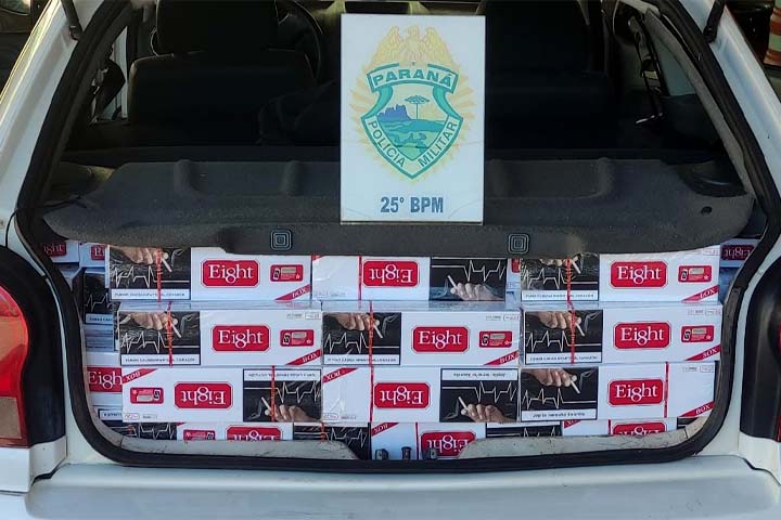 Em buscas no interior do veículo, os policiais encontraram um carregamento com cigarros do Paraguai. Os cigarros estavam com meia carga, todos em maços, fora da caixa. A polícia calcula que foram entre 500 e 700 maços da marca eight.