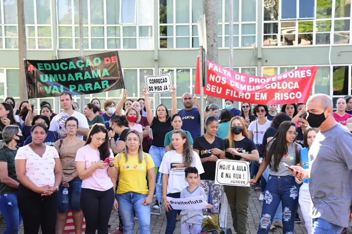 As escolas da rede pública municipal de ensino em Umuarama amanheceram sem aulas nesta quarta-feira (27). Os professores aderiram a uma greve por tempo indeterminado. A principal reivindicação é a readequação do salário de acordo com o Piso Salarial Nacional do Magistério Público da Educação Básica. Em Umuarama, a categoria inicia a carreira com salário de R$ 1.640,00, ou seja, 17% abaixo do valor do pago pelo piso nacional de R$ 1.922,00 para 20h em sala de aula.