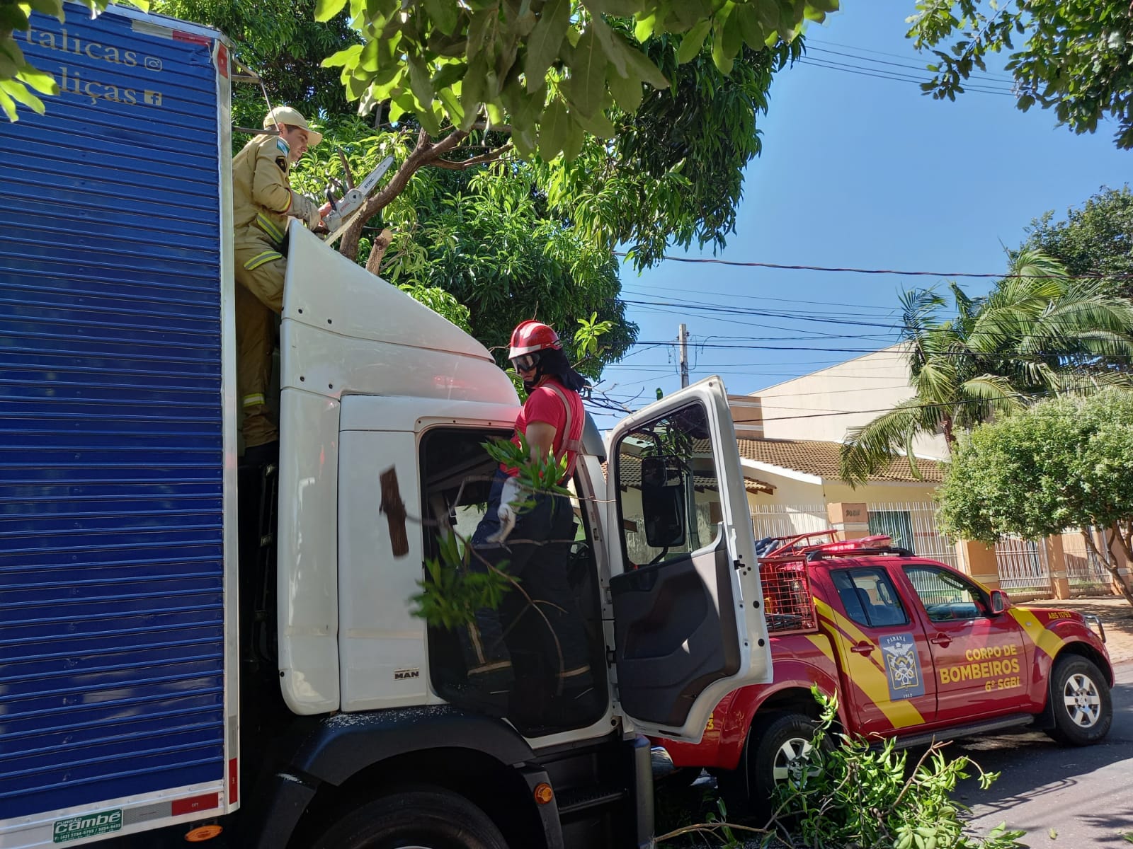O Corpo de Bombeiros Militar de Umuarama prestou atendimento fazendo o corte do galho preso ao caminhão.