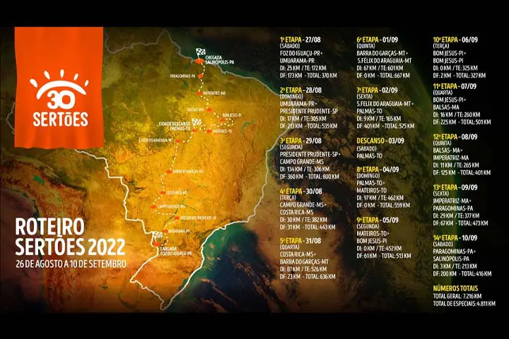 Haverá um dia de descanso em Palmas (TO). A caravana ficará um dia na Região Sul (PR); um dia na Sudeste (SP); quatro dias na Centro-Oeste (MS e MT); quatro dias na Nordeste (PI e MA); e cinco dias na Norte (TO e PA). Com a maior extensão em três décadas, a Dunas Race – organizadora do Sertões – criou duas provas à parte para quem não puder fazer o percurso completo: Sertões Sul e Sertões Norte. O primeiro, de 26/8 a 3/9, com um prólogo e sete etapas e término em Palmas (TO), de onde parte o segundo, também com sete etapas. Serão três em um.