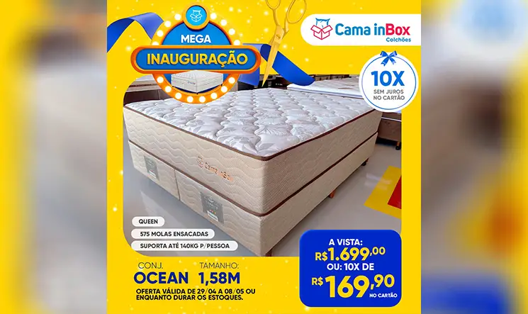 Nesta sexta-feira (29) acontecerá a mega inauguração da Cama in Box e a empresa está oferecendo grandes atrativos. Por ter fabricação própria, a loja possui diversas opções a pronta entrega, oferece produtos de extrema qualidade e está oferecendo grandes promoções de inauguração. Confira as ofertas: