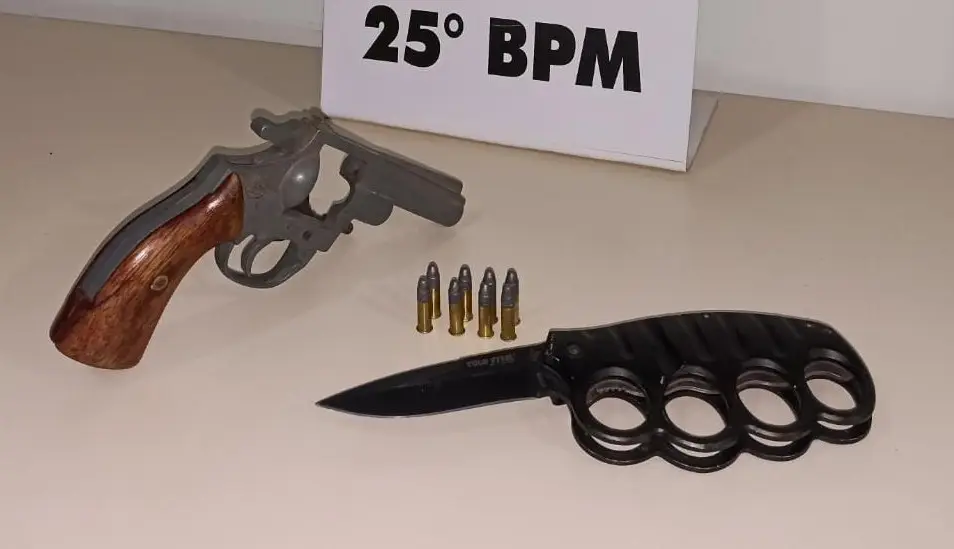 Com as características repassadas do suspeito, no momento da abordagem ele foi visto saindo pelos fundos dispensando a arma no terreno ao lado, os policiais o abordaram e localizaram o revólver calibre 22, além de oito munições intactas. Durante revista no interior do carro, foi encontrado um soco inglês com lâmina.