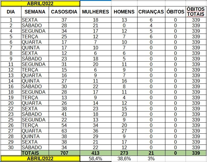 Os meses de janeiro e fevereiro deste ano foram recordistas em números de casos de covid na cidade – 6.980 e 7.205, respectivamente. Em março houve uma queda significativa, com 1.694 e agora, em abril, novamente uma redução foi registrada, tendo encerrado com 707 casos. Mulheres são sempre a maioria dos positivados – 58% (homens foram 39% e crianças 3%).