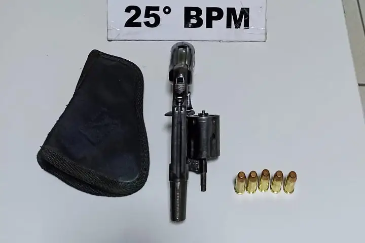 Em continuidade a abordagem foi localizado um revólver calibre .38 em cima de uma mesa, além de cinco munições intactas e um coldre. Não foi possível identificar o proprietário da arma. não sendo possível identificar o proprietário da arma.