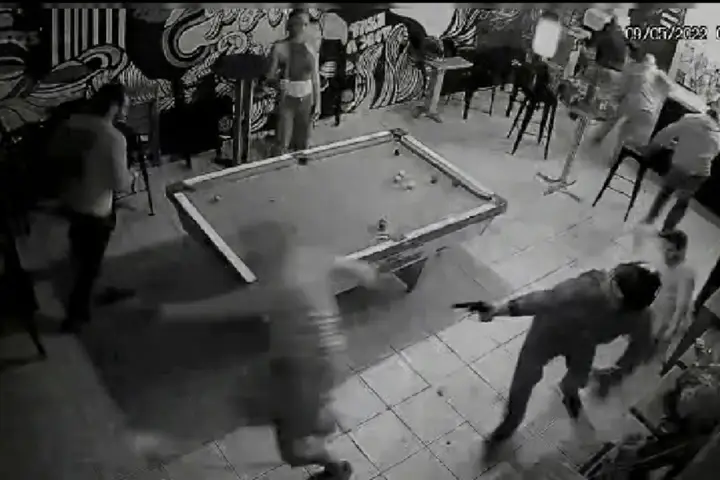 Nas imagens é possível ver que os dois suspeitos entram no estabelecimento – um com capacete de motocicleta e outro com capuz -, quando, no meio de várias pessoas, os acusados abrem fogo contra uma das vítimas, que foi alvejado nas costas e no braço pelos meliantes.