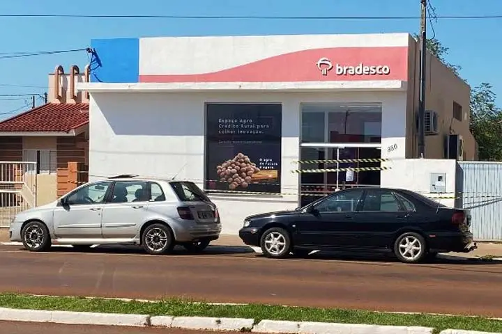 Ladrões entraram na agência do Banco Bradesco na noite de domingo (8) e passaram várias horas no local, até que conseguiram arrombar um caixa eletrônico, utilizando uma serra-copo para metais.