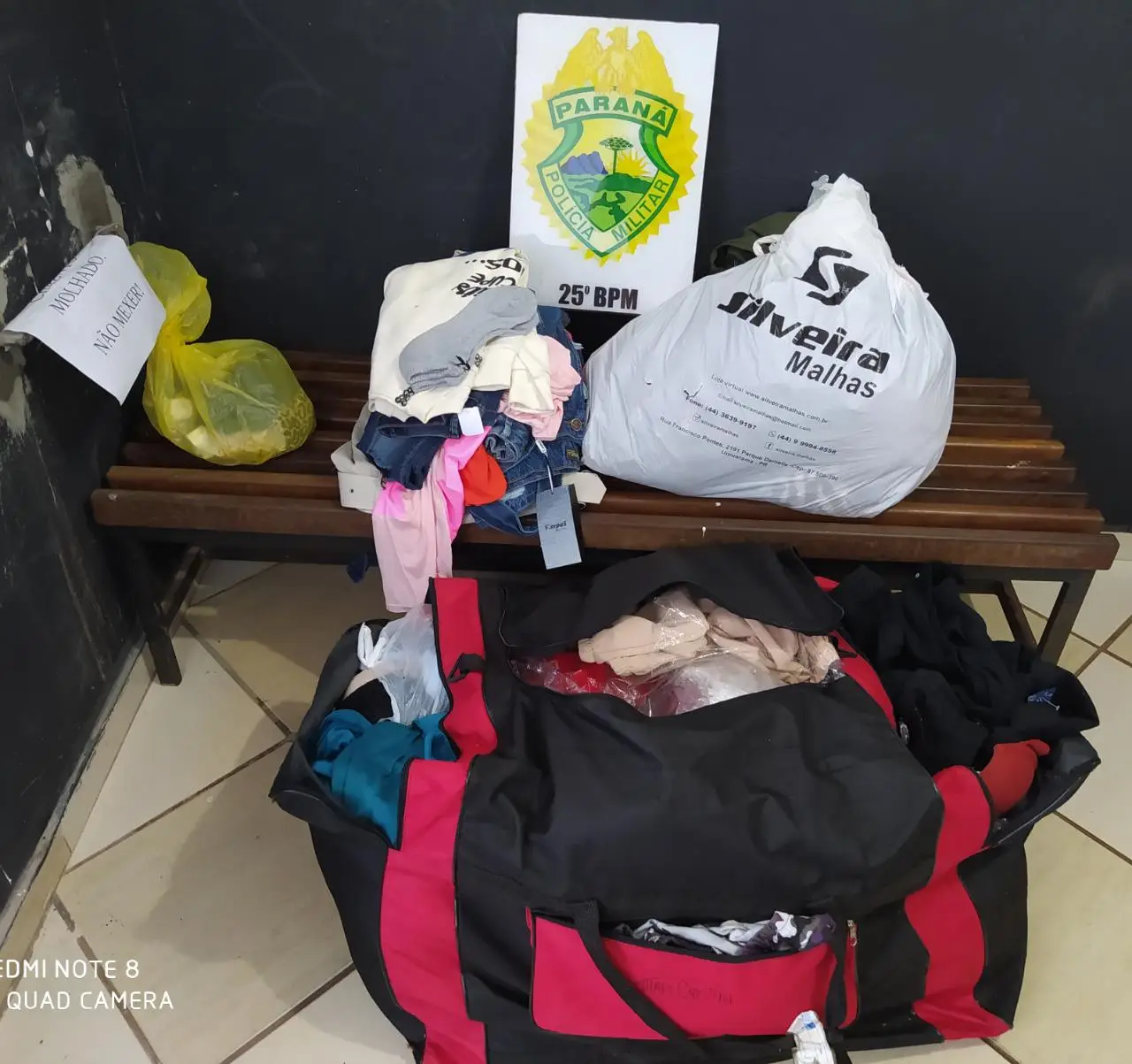 Conforme a PM várias peças de roupas foram encontradas em uma residência abandonada que costuma ser frequentada por usuários de drogas. A equipe policial entrou no local que fica com portão aberto e localizou uma sacola com várias peças de vestuário etiquetadas.