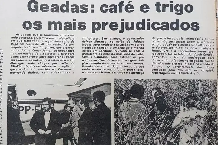 Na madrugada do dia 18 de julho de 1975 o Paraná sentiu os impactos da tão sofrida “geada negra”. Em todos os jornais paranaenses era matéria, inclusive estampando a capa do jornal O Diário do Norte do Paraná. Fotografias eternizaram a destruição causada pela geada que pegou a população de surpresa.