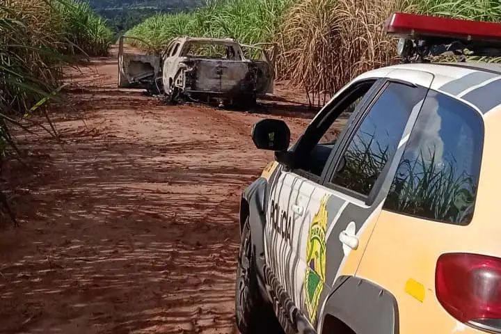 Um veículo incendiado foi recolhido pela Polícia Militar nesta segunda-feira (16), em Mariluz.