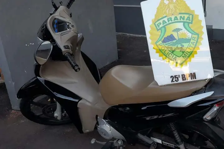 Uma moto Honda Biz que havia sido furtada em fevereiro desde ano foi localizada na Rua Aarapongas, por volta das 15h desta segunda-feira (16). A vítima reconheceu seu veículo e ao se aproximar viu uma marca no pára-choques dianteiro (amassado na ponta). Ao fazer a checagem do número de documentação do motor e do chassi, a PM constatou ser o veículo furtado. A moto foi encaminhada para a Delegacia de Polícia Civil juntamente com um capacete e uma luva de couro que estavam no compartimento interno do bagageiro.