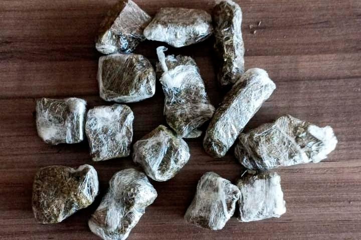 Segundo informações da PM, cerca de 14 porções de droga análoga à maconha foram apreendidas dentro da bolsa dos suspeitos.