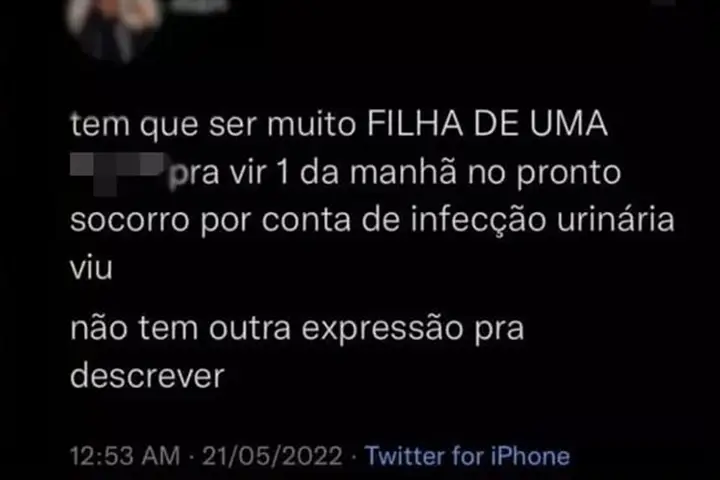 “Tem que ser muito FILHA DE UMA **** pra vir 1 da manhã no pronto-socorro por conta de infecção urinária viu. Não tem outra expressão pra descrever”, publicou a médica, na rede social.