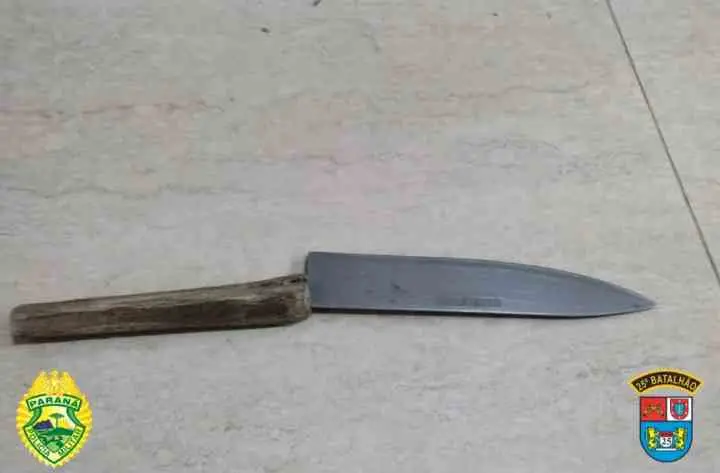 A PM foi até a casa e localizou o suspeito deitado no chão, segurando uma faca e em visível estado de embriaguez. Ele recebeu voz de prisão e foi encaminhado até a autoridade policial competente.