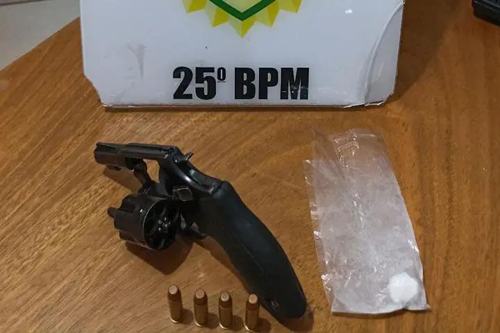 Ao abordar o veículo, os policiais encontraram no porta malas um revólver marca Taurus calibre 38 com numeração raspada e 4 munições intactas. No bolso do condutor do veículo tinha cocaína pesando 4,5 gramas.