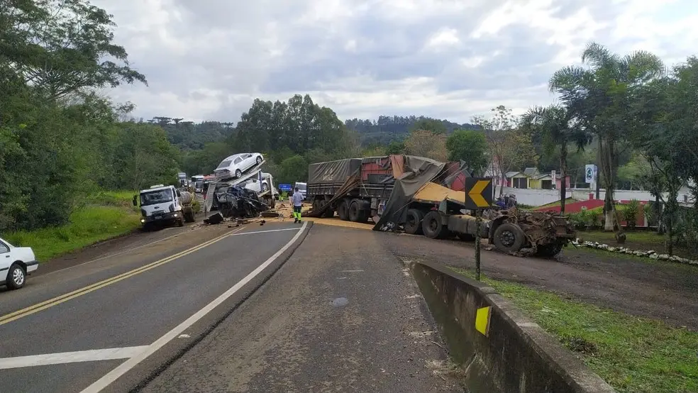 Com o impacto, o caminhão-cegonha se partiu ao meio. Parte dos veículos que eram transportados sofreu avarias ou ficou destruída. O motorista de um dos veículos não resistiu aos ferimentos e morreu. A PRF não informou a identidade da vítima e qual dos caminhões ele dirigia.