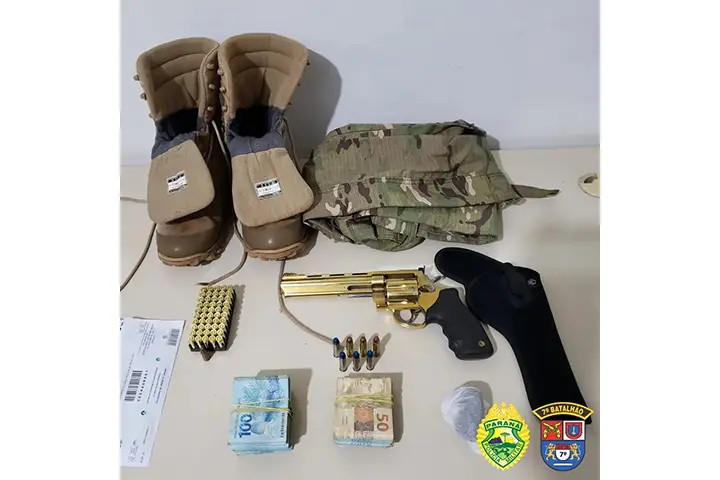 Após denúncias, o 7º Batalhão da Polícia Militar apreendeu, no último domingo (5), um revólver, munições, dinheiro, drogas e até um carro roubado em uma residência do município de Goioerê.