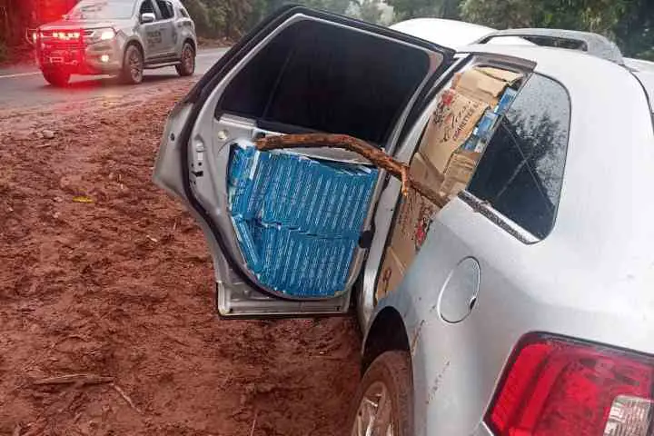 Houve perseguição policial e o motorista do veículo acabou entrando em uma valeta de barro. O condutor, que fazia parte de um comboio, conseguiu fugir, levando muita lama nos pés, é claro. O Ford Edge prata, ano 2013, placas FMV3G10, foi apreendido juntamente com o cigarro.