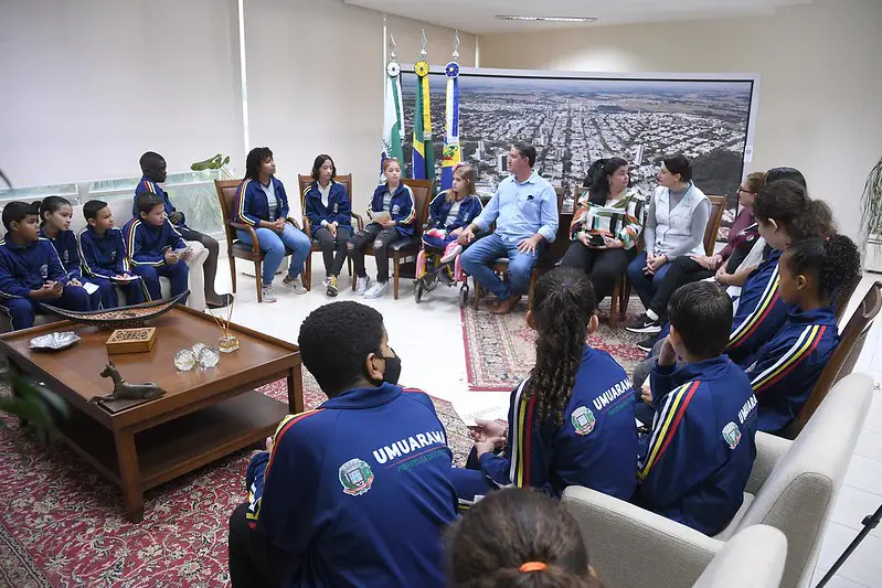 Na terça-feira (7), estudantes do 5º ano da Escola Cândido Portinari visitaram o Gabinete e ‘entrevistaram’ o prefeito, dentro do projeto Mostra Cultural 2022, sob a supervisão das professoras Josiane Felix e Francielli Salustiano e da coordenadora Cristiane Fagotti Gaiarini.
