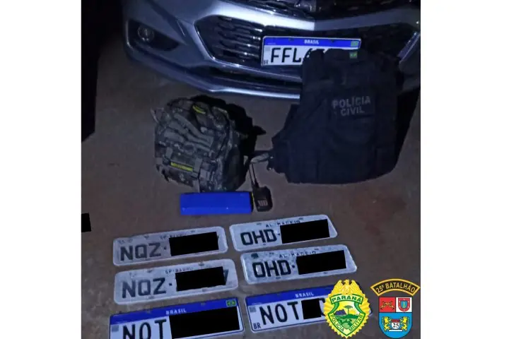 No local não foi encontrado nenhum morador ou suspeito de praticar os crimes, porém foram apreendidos três veículos, dentre um Chev/Cruze, Ford/Fusion, e uma caminhonete Chev/S10; além de 885 gramas de maconha, um rádio comunicador portátil, dois pares de placa de veículo e até um colete balístico.