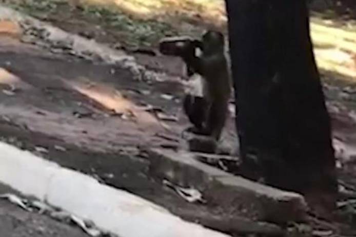 No vídeo, é possível ouvir as reações de surpresa da mulher ao observar o pequeno primata virando a garrafa com bebida no meio da calçada. “Olha, tomando cerveja”, exclama a jovem.