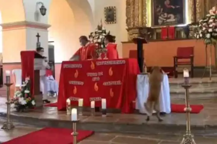 No vídeo, é possível ouvir algumas pessoas que acompanhavam a missa rindo da situação enquanto o cachorro sai de fininho.