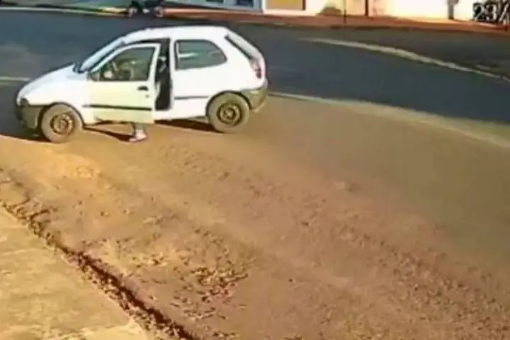 O homem ainda tenta a todo custo religar o automóvel, porém não consegue e acaba abandonando o Palio no meio da via.