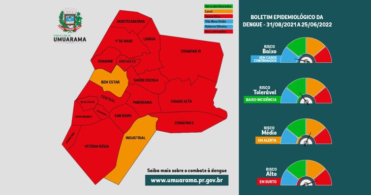 Já são 100 bairros, praças e logradouros com casos positivos da doença. Das 18 unidades básicas de saúde da cidade, 16 regiões enfrentam surto de dengue, bem como o distrito de Santa Eliza e o povoado Vila Nova Jerusalém. As UBS Bem-Estar e Parque Industrial, bem como o distrito de Lovat, estão em situação de alerta diante do aumento no número de casos.