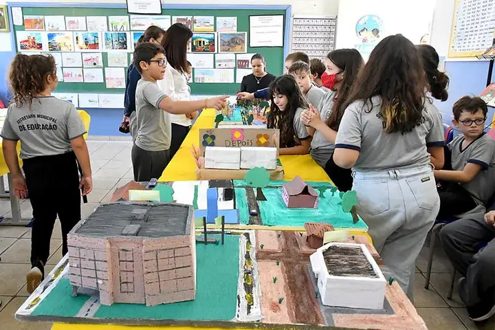 Com muita criatividade, cada unidade escolar mobilizou as suas turmas de educação infantil e ensino fundamental (séries iniciais) para produzir desenhos, painéis, faixas e artefatos diversos para contar histórias da escola, da infância, da vida simples no passado e da cidade.