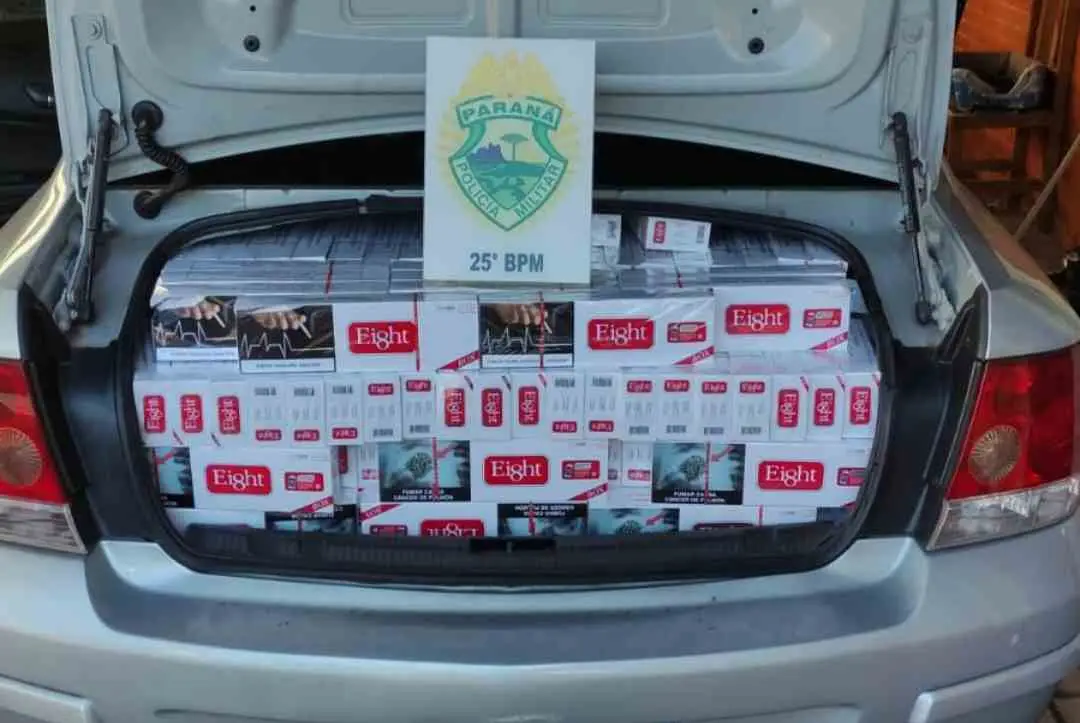 Na busca pessoal nada de ilícito foi encontrado com os ocupantes. Porém, foi constatado que no interior do veículo havia aproximadamente 18 caixas de cigarros contrabandeados do Paraguai.