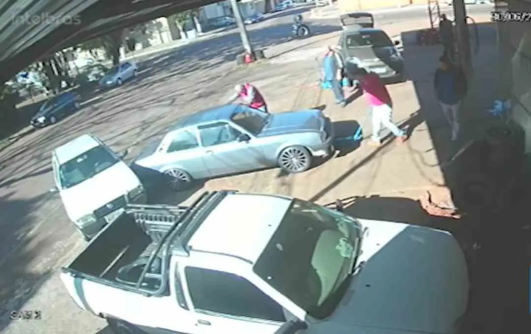 Câmeras de segurança registraram o fato. As imagens mostram o momento em que o motorista sai bruscamente da borracharia levando um macaco hidráulico.